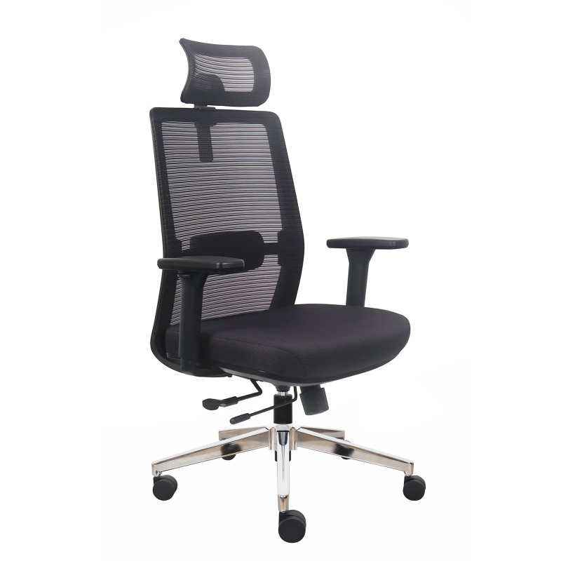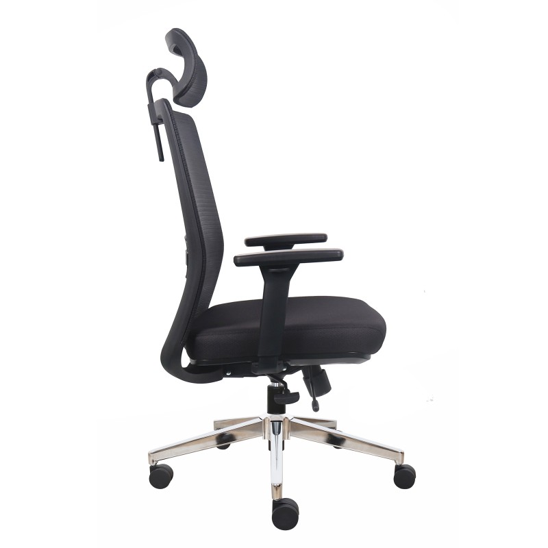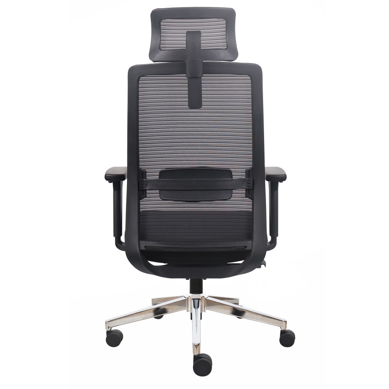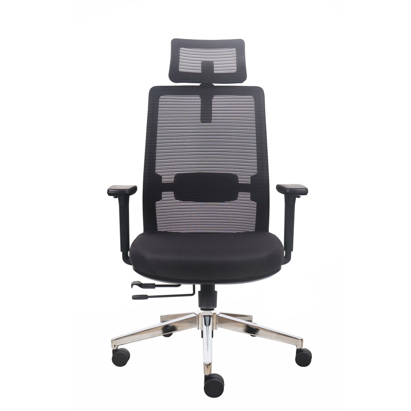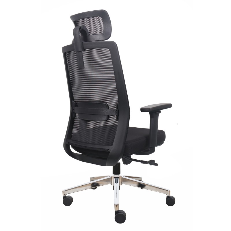 Fotel ergonomiczny z siatkowym oparcie z zagłówkiem, tapicerowane pianką wtryskową i tkaniną. Podparcie odcinka lędźwiowego kręgosłupa tapicerowane oraz regulowane na wysokość. Zagłówek 2D tapicerowany siatką. Podłokietniki 3D z nakładką PU. Metalowa, chromowana podstawa z kółkami do powierzchni twardych. Fotel posiada pozytywny Protokół Oceny Ergonomicznej. Realizacja zamówienia do 7 dni.