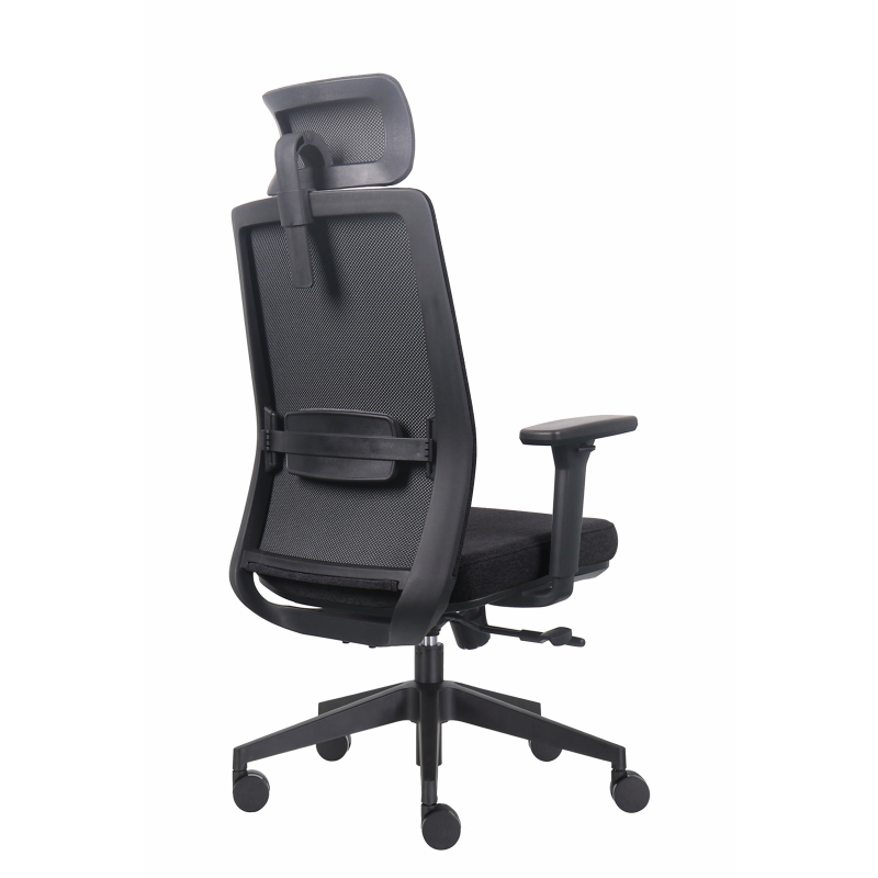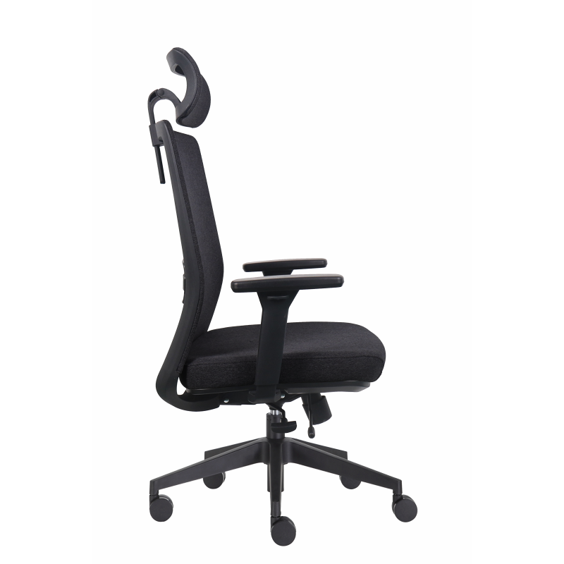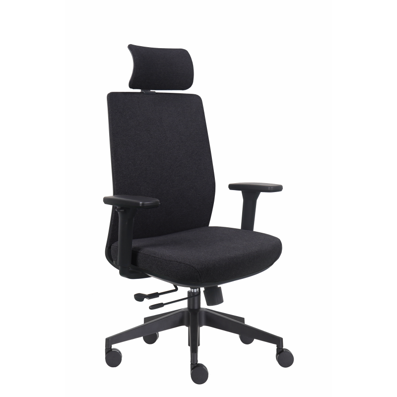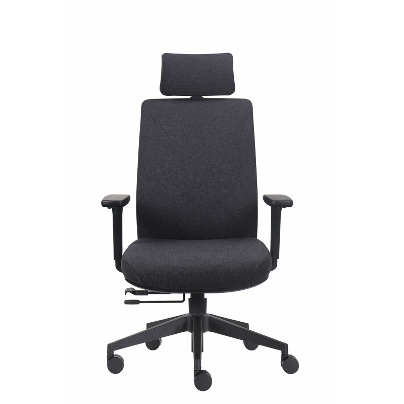 Fotel ergonomiczny z tapicerowanym oparciem i zagłówkiem. Siedzisko tapicerowane pianką wtryskową i tkaniną siedzisko. Pochylenie oparcia z możliwością blokady w trzech pozycjach z funkcją "ANTI SHOCK". Podparcie odcinka lędźwiowego regulowane na wysokość. Zagłówek 2D. Podłokietniki regulowane 3D z nakładką PU. Fotel posiada pozytywny Protokół Oceny Ergonomicznej. Realizacja zamówienie do 7 dni.